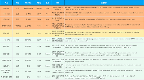 在胸腺上皮肿瘤、头颈鳞癌、肉瘤、前列腺癌、甲状腺癌等其他多个疾病领域,卡瑞利珠单抗、阿帕替尼、瑞维鲁胺、阿得贝利单抗、法米替尼、HRS-7058、HRS-4642、HRS-5041等抗肿瘤创新药相关研究一共入选了4项口头报告、1项简短口头报告、5项壁报,彰显了AG百家乐医药强大的研发实力。此外,海曲泊帕和昂丹司琼口溶膜分别在防治化疗导致的血小板减少和恶心呕吐方面各有1项研究入选壁报。